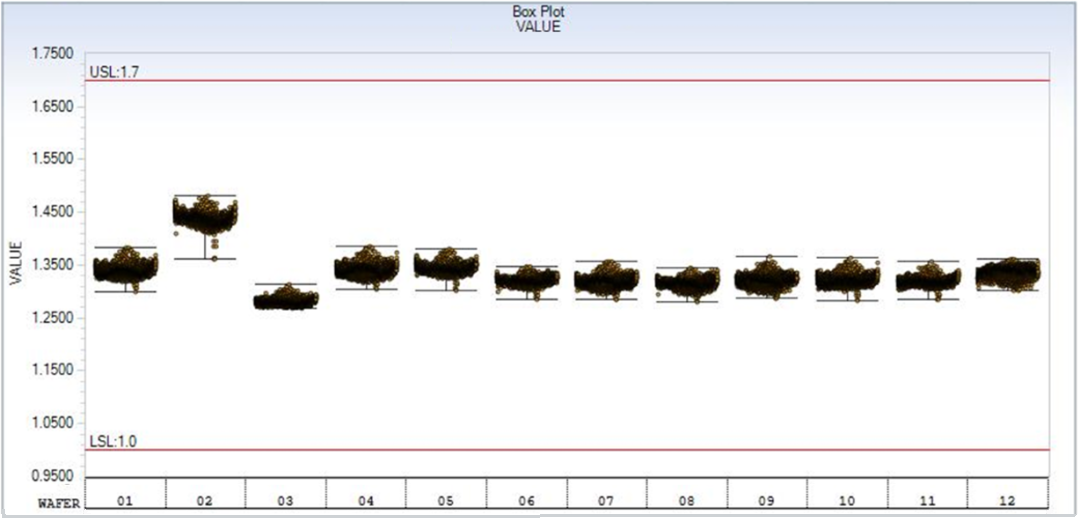從目前的產出數據來看對于部分共性參數,芯片數據集中度高,特性一致性好,與原8寸生產相比特性一致。