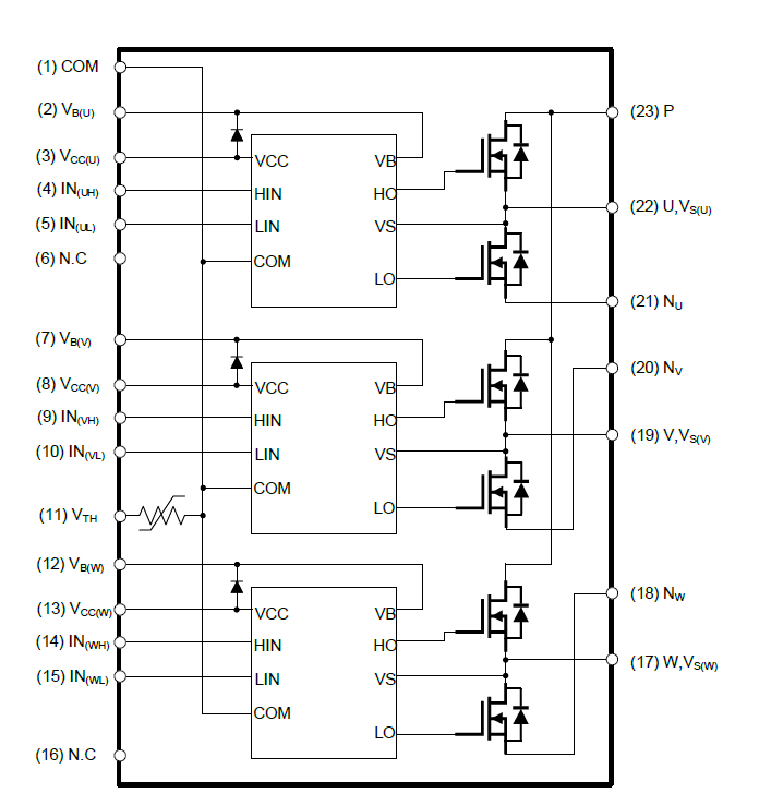 IPM23_MOS新系列產品內部驅動集成了自舉電路、防直通互鎖、欠壓保護與溫度輸出功能,優化的高壓柵極驅動配合內集成快速恢復二極管的MOSFET,極大地改善產品工作EMI與開關損耗。產品封裝采用框架全塑封結構,模塊體積小、功能齊全、功率密度高、熱阻小,絕緣等級能滿足各種裝配場景需求。